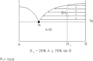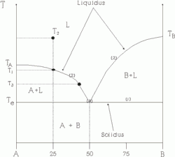 El líquido que queda es estable hasta que alcanza la temperatura eutéctica (3), donde hay un 45% de A, 55% de B, siendo el resto líquido. Hay que descatar que si la temperatura a la que está este líquido bajase una milésima de grado, el líquido cristalizaría rápidamente, quedando cristales de A y B. La roca resultante tendría una composición del líquido de partida con un 75% de A y un 25% de B.