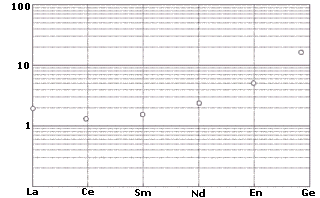 En el eje de ordenadas (escala logarítmica) se representan los datos que corresponden a la concentración de un elemento normalizada, es decir dividida por la concentración de la de una roca tipo que es la que sirve para normalizar), entonces la relación es:
