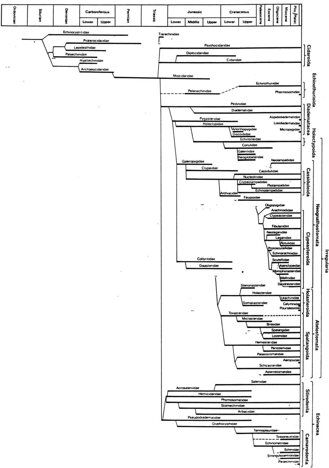 Jurásico: Diversificación de los equinoideos irregulares, con spatangoides, clypeasteroides y holectupoides.