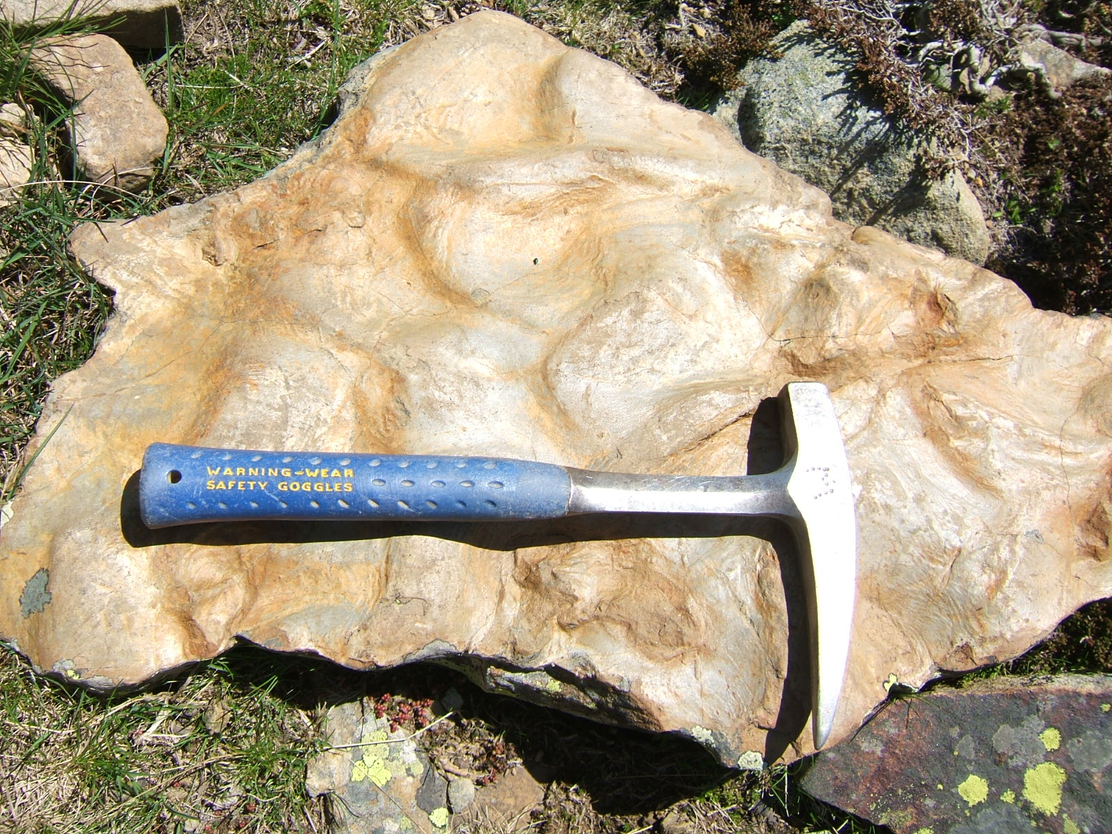 En la fotografía aparece un fragmento de un estrato correspondiente a los materiales que afloran en las proximidades del Pico Urbión (Grupo Urbión?). En su superficie se pueden observar unas estructuras de corriente (ripplemarks) linguoides y de tamaño centimétrico. La forma, ligeramente linguoide, generalmente simétrica, nos está indicando por un lado, la dirección de la corriente, por otro la velocidad de la corriente, en este caso, elevada, asi como la profundidad -de acuerdo a la clasificación de estas formas que varía desde los rectos (mayor profundidad-menor velocidad), pasando por los sinuosos y terminando en los linguoides (menor profundidad-mayor velocidad), bien sean simétricos o asimétricos.