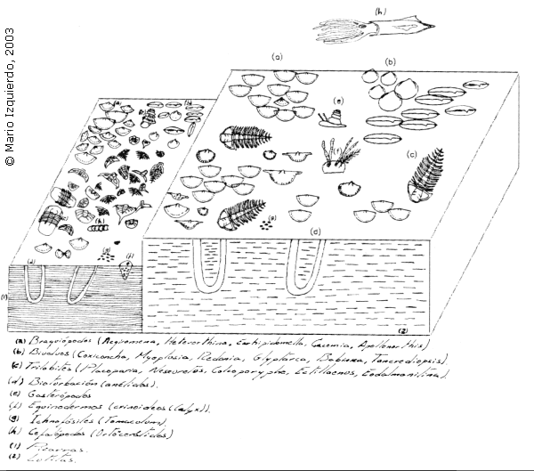 El paleoambiente que está indicando el tomaculum, corresponde a un medio de baja energía. Para el conjunto de la asociación fósil donde aparece este ichnofósil, tendríamos un paleoambiente que viene representado por el bloque de la izquierda (pulsar sobre la imagen para aumentar). Para los que no estén familiarizados con las reconstrucciones paleoambientales, en el bloque inferior aparecen representados los restos fósiles encontrados en el estrato, en el bloque superior (derecha), aparece la reconstrucción paleoambiental.