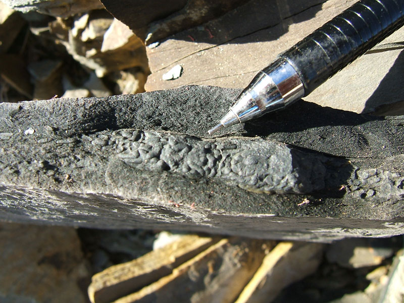 En la fotografía se observa un resto fósil procedente de un estrato de pizarras del Ordovícico de los Montes de Toledo. Este fósil, se denomina tomaculum, se trata de un agregado de partículas fecales de distintos organismos (trilobites), ovaladas, de entre 0,5mm y 1,5 mm, como se puede observar en la fotografía.