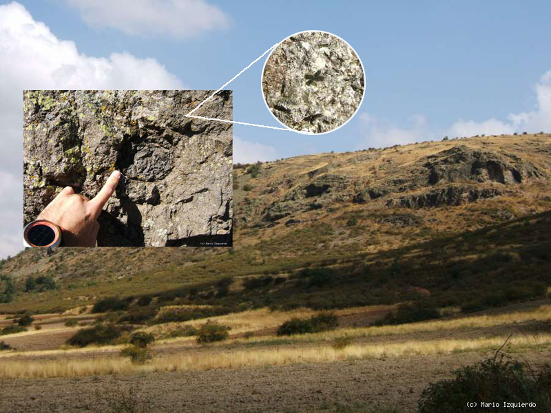 En la fotografía aparece un enclave dentro de las andesitas que afloran en distintos puntos cerca de Atienza (localidad española dentro de la provincia de Guadalajara que dista aproximadamente 89 Kms. de Madrid por carretera, en torno a 75 Kms. más, si pasamos por Sigüenza -hoja 39 del mapa 1:200.000 del IGME-, aunque merece la pena.). El que aparece en la fotografía, se sitúa más al W.