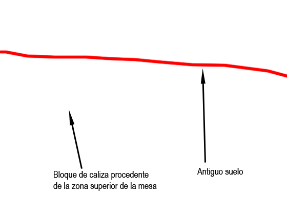 En la fotografía se observa un bloque de caliza procedente de la zona superior de la mesa que ha quedado incluido en los sedimentos. Se puede apreciar también una línea oscura sobre el bloque que delimita un antiguo suelo.