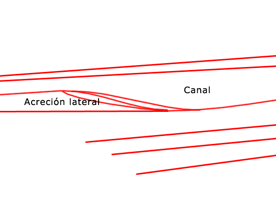 En la fotografía que corresponde a una secuencia del Buntsandstein (Tríasico Inferior) constituido por areniscas y arcillas, se puede apreciar una forma cóncava que se acuña lateralmente (hacia la izquierda) y formas sigmoidales en la parte de la izquierda que correspondería a un fenómeno de acreción lateral en un canal.