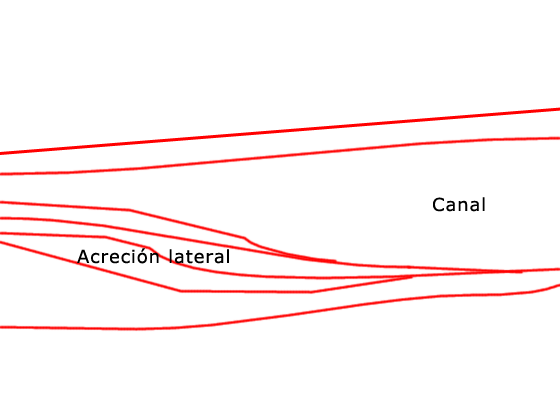 En la fotografía que corresponde a una secuencia del Buntsandstein (Tríasico Inferior) constituido por areniscas y arcillas, se puede apreciar una forma cóncava que se acuña lateralmente y formas sigmoidales en la parte de la izquierda que correspondería a un fenómeno de acreción lateral en el canal.